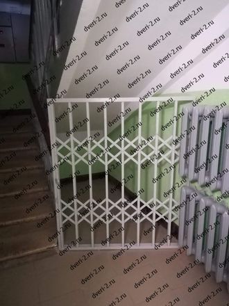 Раздвижная решетка с раздвиганием в 1 сторону. Установлена под лестницей в подъезде на 1 этаже, для выгородки помещения для колясок и велосипедов.