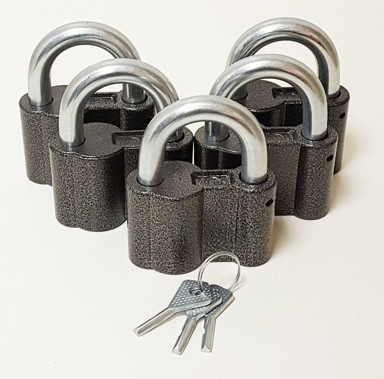 Комплект из пяти навесных замов под один комплект ключей. ЧАЗ ВС-2А - Замок навесной серия под 1 ключ. Замок серии "Усиленная защита" - надежная охрана вашего имущества. Высокий уровень защиты - это массивный корпус из сплава с высоким содержанием броневого алюминия, качественный механизм секрета без пластмассовых деталей, толстая стальная дужка.