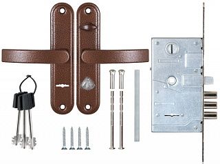 Основной нижний сувальдный замок с защелкой и комплектом ручек. Цвет антик медный.